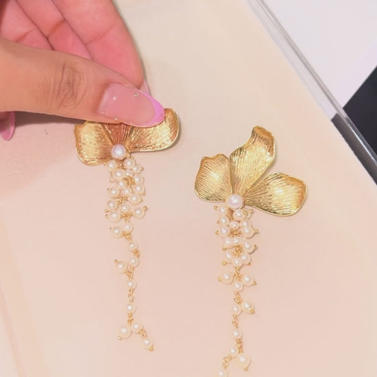 Elegant matte-finished brass earrings adorned with lustrous pearls. These refined pieces combine the warmth of brushed brass with the timeless sophistication of pearl accents, creating a versatile accessory perfect for both everyday wear and special occasions.